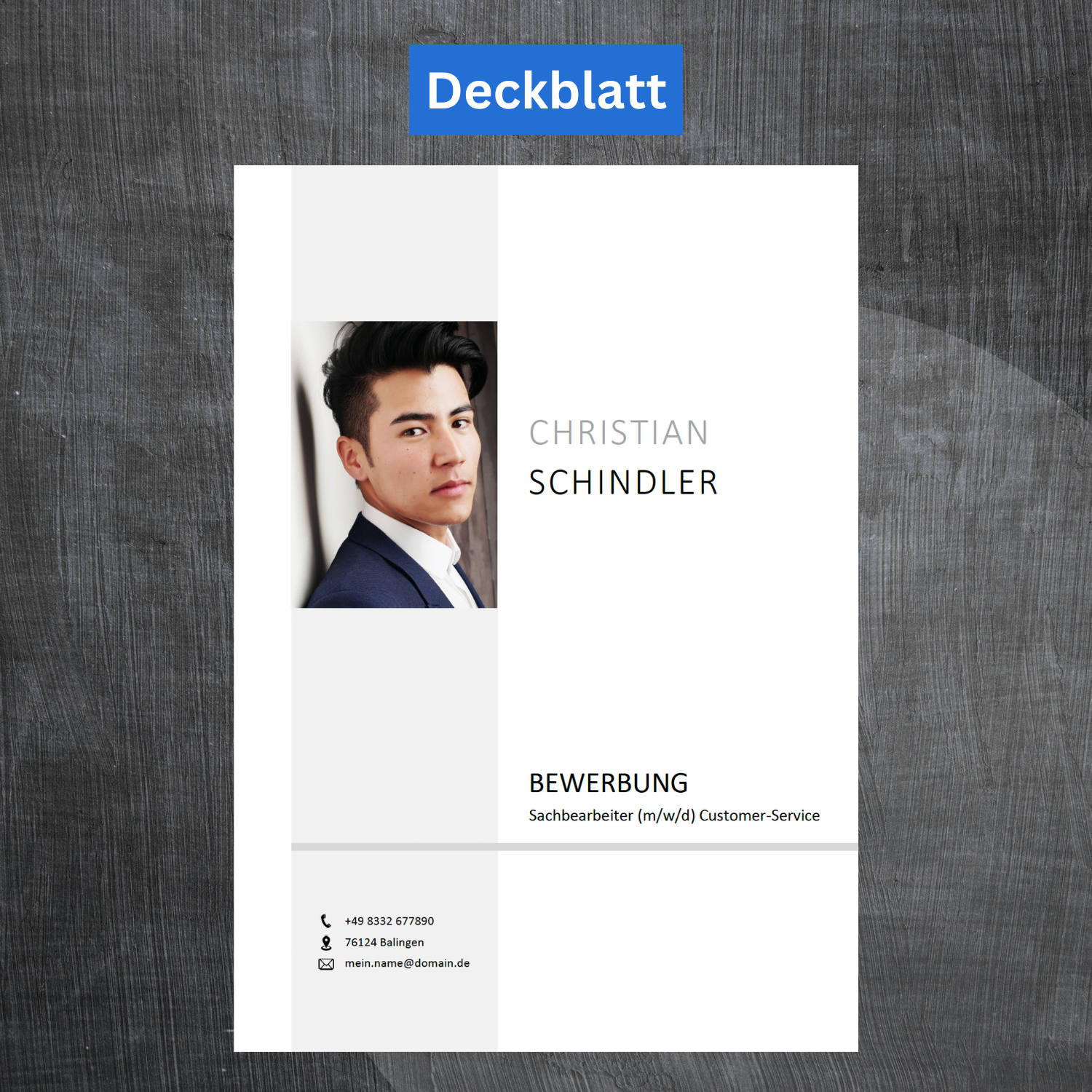 Die Vorlage mit Deckblatt, Anschreiben und Lebenslauf bietet hohe Erfolgschancen mit Deiner Bewerbung. Die Präsentation Deiner Skills und Daten ist schlicht und fokussiert.